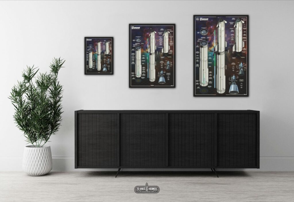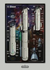 Wyjątkowy plakat prezentujący szczegóły techniczne prototypowej rakiety Starship kampanii testowej 2023 – 2025.